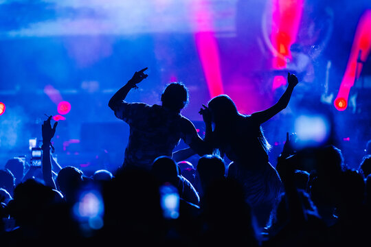 A lively concert scene featuring a cheering crowd immersed in vibrant lights, capturing the excitement and energy of the live music performance.