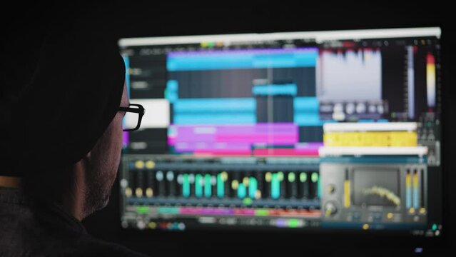 Shot of a Modern Music Record Studio Control Desk with Computer Screen show User Interface of DAW Software with Song Playing. Equalizer, Mixer and other Professional Equipment.