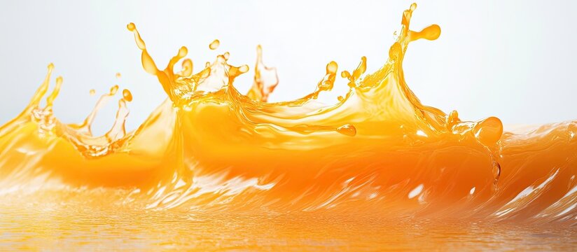 Vibrant orange water splash flowing dynamically across a clean white background with various splashes and droplets creating a lively effect.