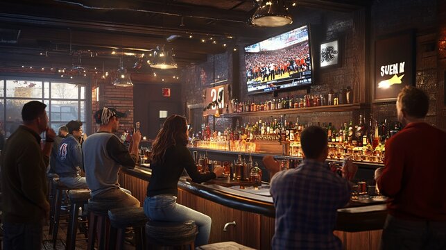 Group of diverse adults enjoying drinks at a lively bar while watching a sports game on TV.