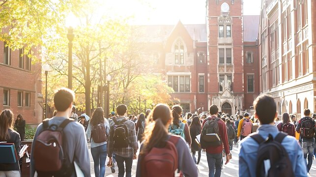 A bustling university campus during exam season, students walking with books and laptops, bright spring sunlight, a lively and energetic scene full of determination