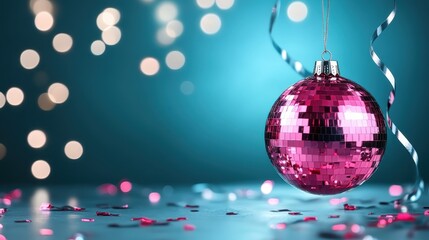This shiny pink disco ball is suspended in mid-air above scattered celebratory confetti, radiating joy and vibrancy for lively gatherings and parties.