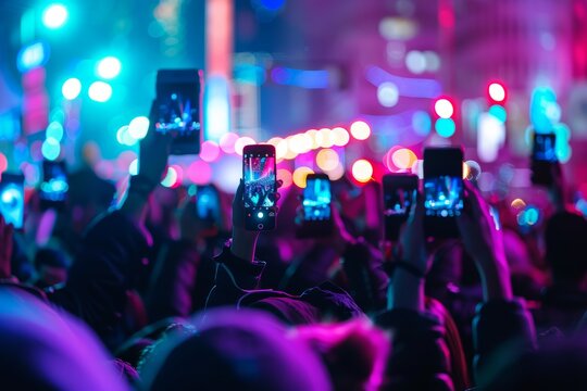 Vibrant Night Festival with Crowd and Colorful Lights Capturing Moments on Phones - Perfect for Event Promotion