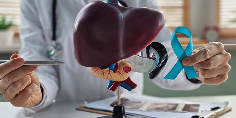 Health worker holding liver model and turquoise ribbon to raise awareness liver disease and oncology cancer