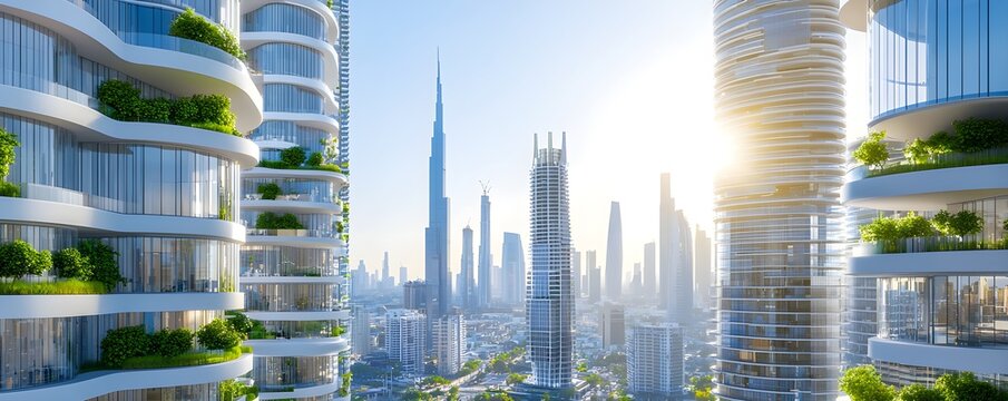 Eco-friendly urban landscape featuring innovative renewable architecture, lush greenery, sustainable design, vibrant community spaces, modern city living