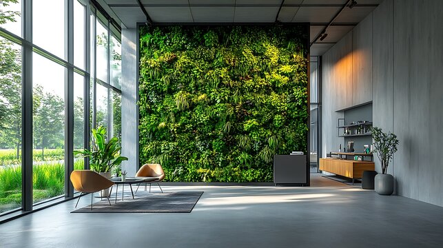 Green living wall with perennial plants in modern office. Urban gardening landscaping interior design. Fresh green vertical plant wall inside office