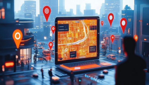 The concept of local SEO promotion, market research and competitor analysis. The work of the marketing department, analytics, data collection, delivery logistics, cost reduction. Flat vector illustrat