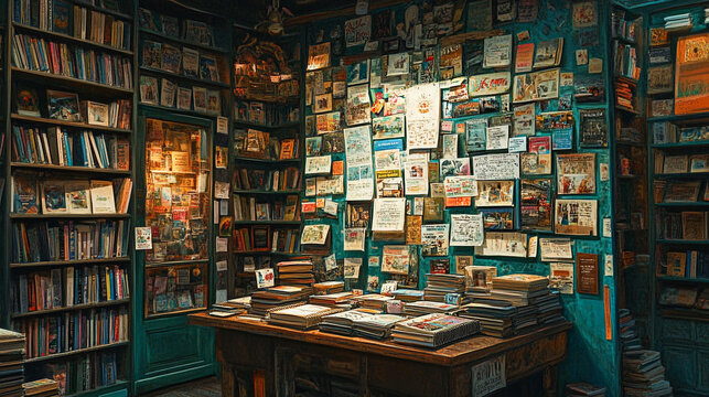 A weathered community bulletin board covered with various tattered papers and notes, held by colorful thumbtacks, tells a story of local life and events.