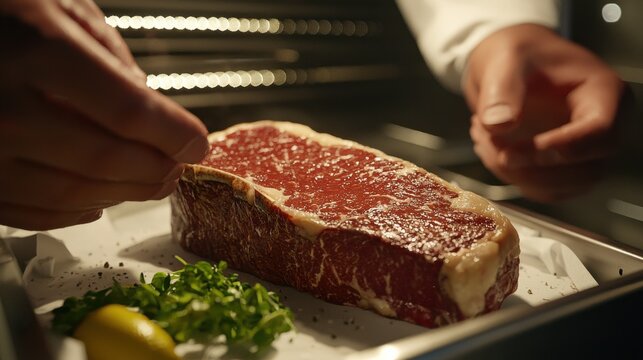 Male butcher inspecting premium cut of meat in a butcher shop, surrounded by various meat selections, showcasing quality groceries and fresh produce for culinary enthusiasts