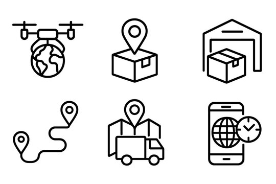 outline vector icons of global delivery systems: drone with globe, location package, delivery time zone, global warehouse, logistic route icon, local courier map, drop point Earth, tracking icon. set