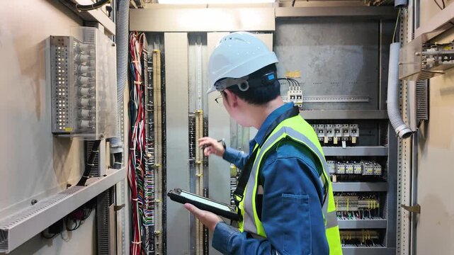 Professional electrician performing maintenance job indoors