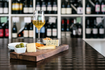 Sampling Of Cheeses On A Board With White Wine
