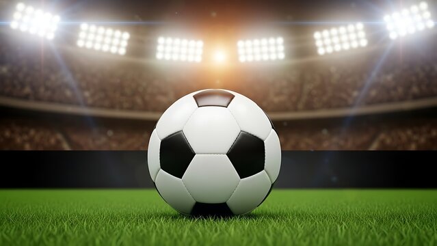 A soccer ball on a green field in a stadium with bright lights
