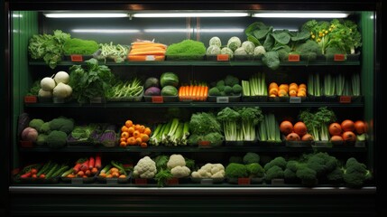 Bright grocery store showcase close-up for advertising organic produce and healthy food