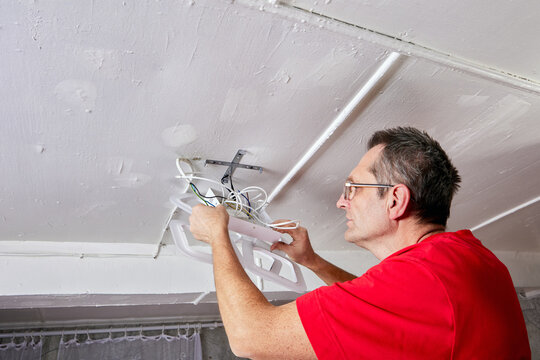 Mounting electrician lifts LED chandelier to ceiling in rural house, wires positioned for connection, fixture aligned with bracket.