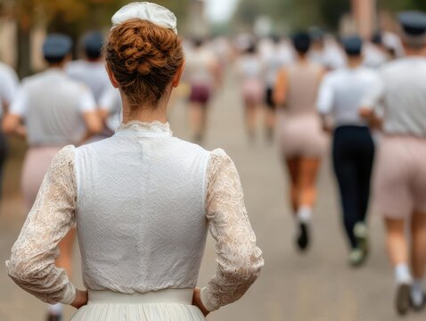 Labor Day marathon through a historic district, with participants wearing vintage clothing and accessories, Labor Day race, historical tribute