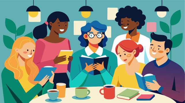 In a local coffee shop a diverse group of individuals from the community bonded over their shared passion for reading and stimulating discussions.. Vector illustration