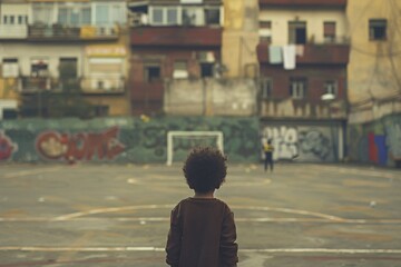 Child Standing Alone in an Urban Soccer Court