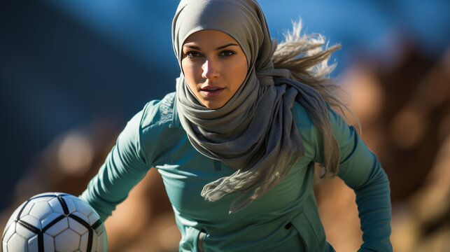 Inspirational Saudi female soccer player in hijab and sports gear, skillfully dribbling the ball on field promoting empowerment and breaking cultures barriers.