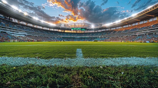 Vibrant Sunset Over a Packed Stadium During Exciting Soccer Match Nearing the End of the Game. Generative AI