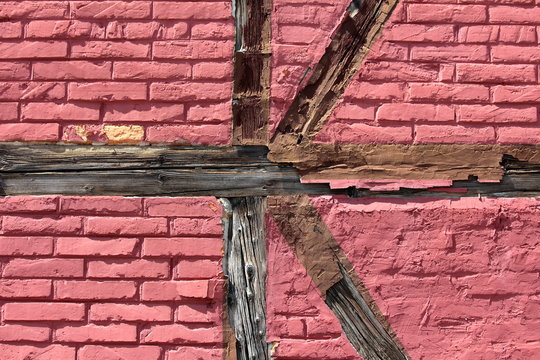 Damaged freshly painted dark red cracked bricks mixed with wooden support beams texture on local train station building wall background wallpaper
