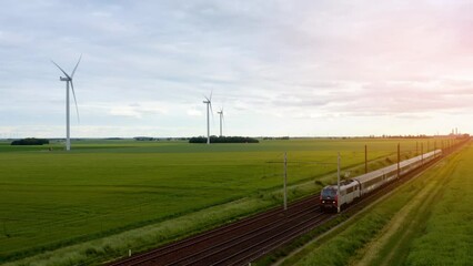 Aerial view of local train traveling through green fields under sunset sky and giant wind turbines. Train, railway in the meadow, windmills in the distance, sunset sky, Drone 4K. High-speed train.