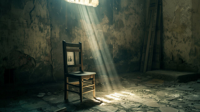 Empty wooden chair with vintage picture placed on seat in quiet room, conveying solitude, nostalgia and emotional memories of missing someone special.