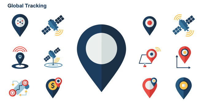 Global navigation icons: map pin and satellite for digital tracking solutions
