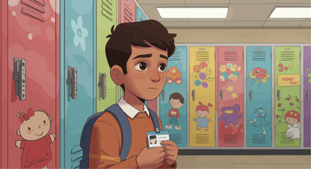 Young boy standing by school lockers looking concerned, concept of Going to School