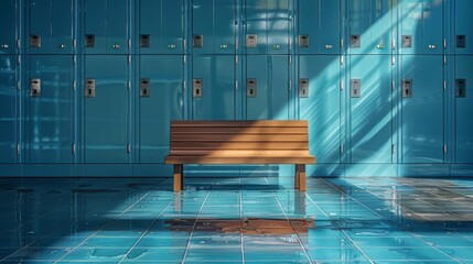 Sunlit Bench in Front of Blue Lockers in Gym Changing Room Interior View
