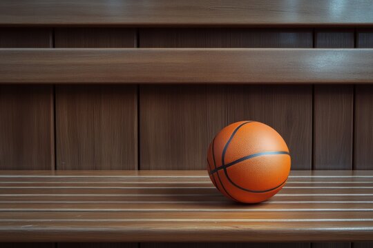 Orange basketball on wooden bench with space for text