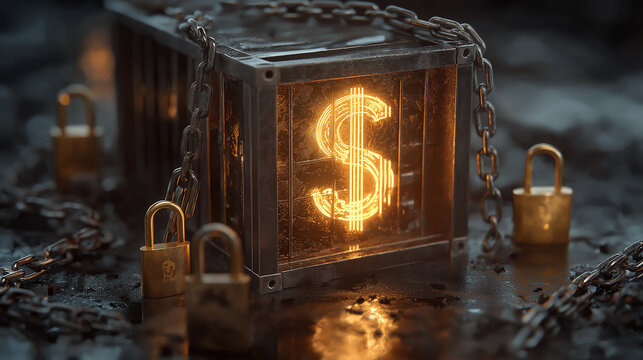 A locked container with glowing dollar signs inside, surrounded by padlocks labeled duties, VAT and  surcharges
