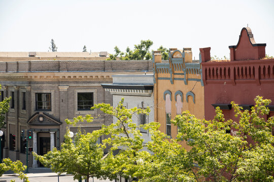 Lodi, California, USA - July 16, 2021: Sunlight shines on the historic downtown buildings of Lodi.