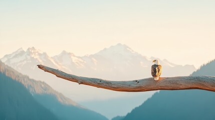 Majestic eagle perched on a large branch overlooking snowy mountain peaks and a valley at sunrise.