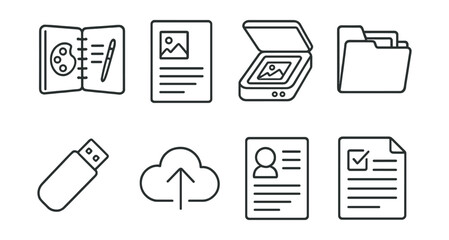 Line style icons of documentation and archive: artist logbook icon, work catalog sheet, high-res photo scanner, folder of WIPs, labeled USB drive, online archive symbol, artist CV doc, media release