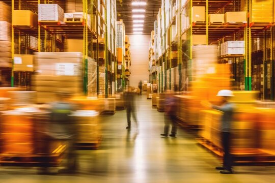 Blurred image of warehouse employees logistics staff in uniform working in actions on forklift, Generative AI