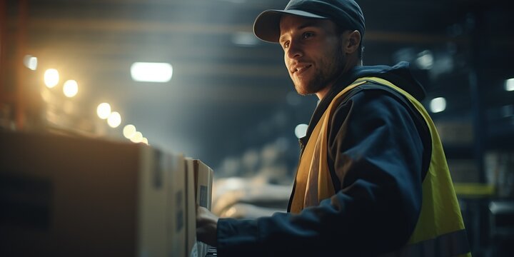 Smiling delivery worker in warehouse promoting logistics efficiency