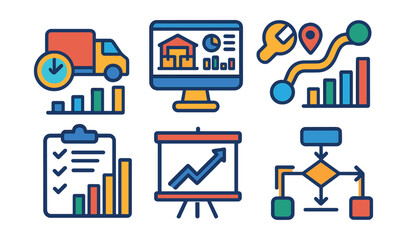Flat vector icons of supply chain and logistics analytics: delivery time graph, warehouse data dashboard, logistics optimization icon, route efficiency chart, inventory report, demand forecast,