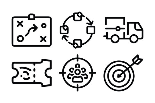 A comprehensive collection of line art icons representing postal services and mail delivery, including envelopes, a post office building, a mailbox, delivery trucks, packages, a postal worker's cap