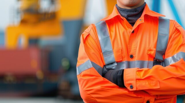 Portrait of a worker wearing high visibility safety gear and uniform for cargo handling tasks in an industrial warehouse or logistics facility