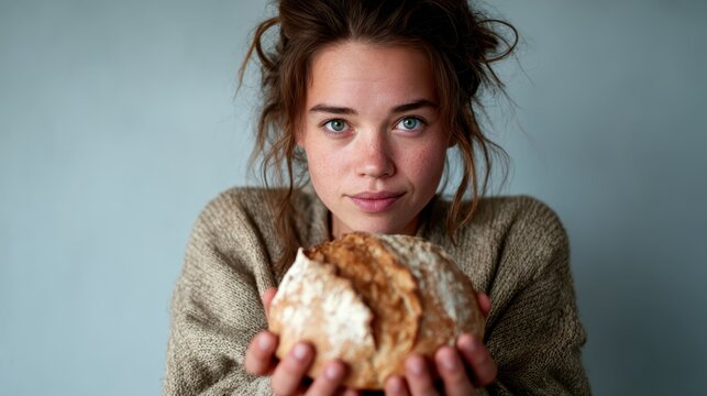 A young woman beams with happiness as she presents a freshly baked loaf of bread, symbolizing warmth, comfort, and the joy of homemade food.