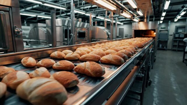 Automated bakery conveyor line with freshly baked bread loaves, representing industrial food production, mass baking and factory process efficiency