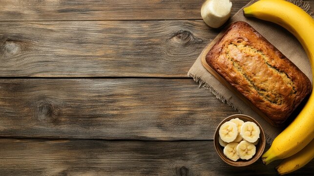 Freshly baked sourdough bread loaf with sliced bananas on a wooden board