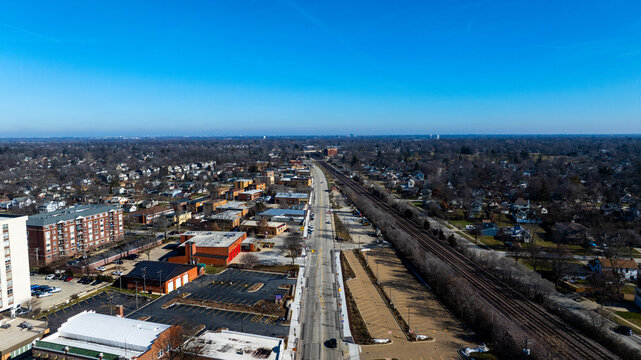 Panorama view aerial Lombard Street, an east–west street in San Francisco, California. Famous for steep, one-block section with eight hairpin turns. Crookedest, steep hills, sharp curves, one-way road