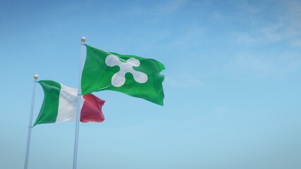 Waving flags of Italy and the Italian region of Lombardia against blue sky backdrop. 3d rendering