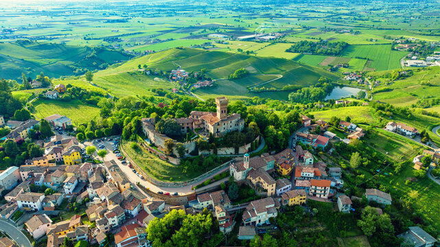 Ancient castle in the town of Cigognola, a view of town from a height. Drone photo