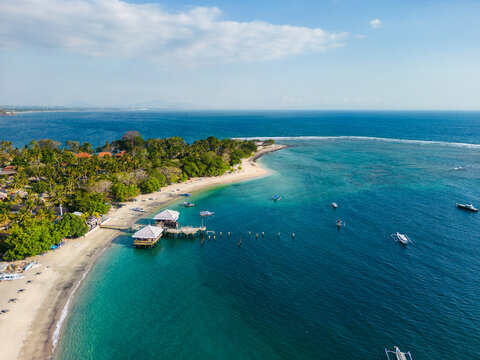 Beautiful cliffs formations on Lombok. Boats parked on the shores on the Pink Beach, Crystal clear water. Captured with a drone. Nice overlook on the bigger part of the island.