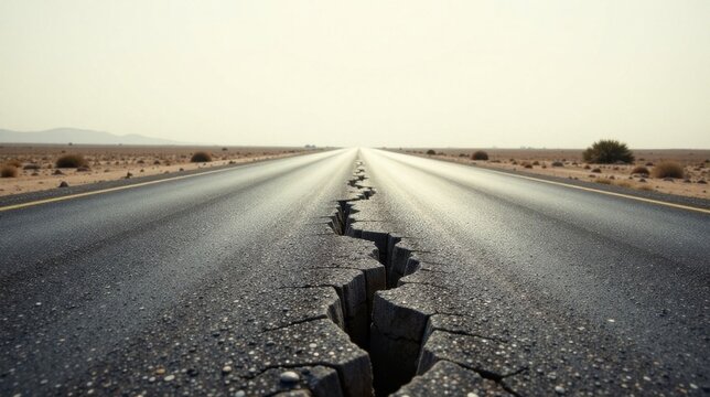 A long, desolate highway stretches into the distance, its surface marred by a significant crack running down the center, a visual metaphor for division or disruption