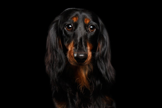 Portrait of Sad Dachshund Dog, Looking in camera on Isolated Black background, front view