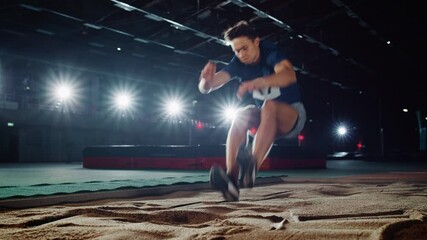 Sportswoman jumping into sandpit on triple jump competition in track and field championship